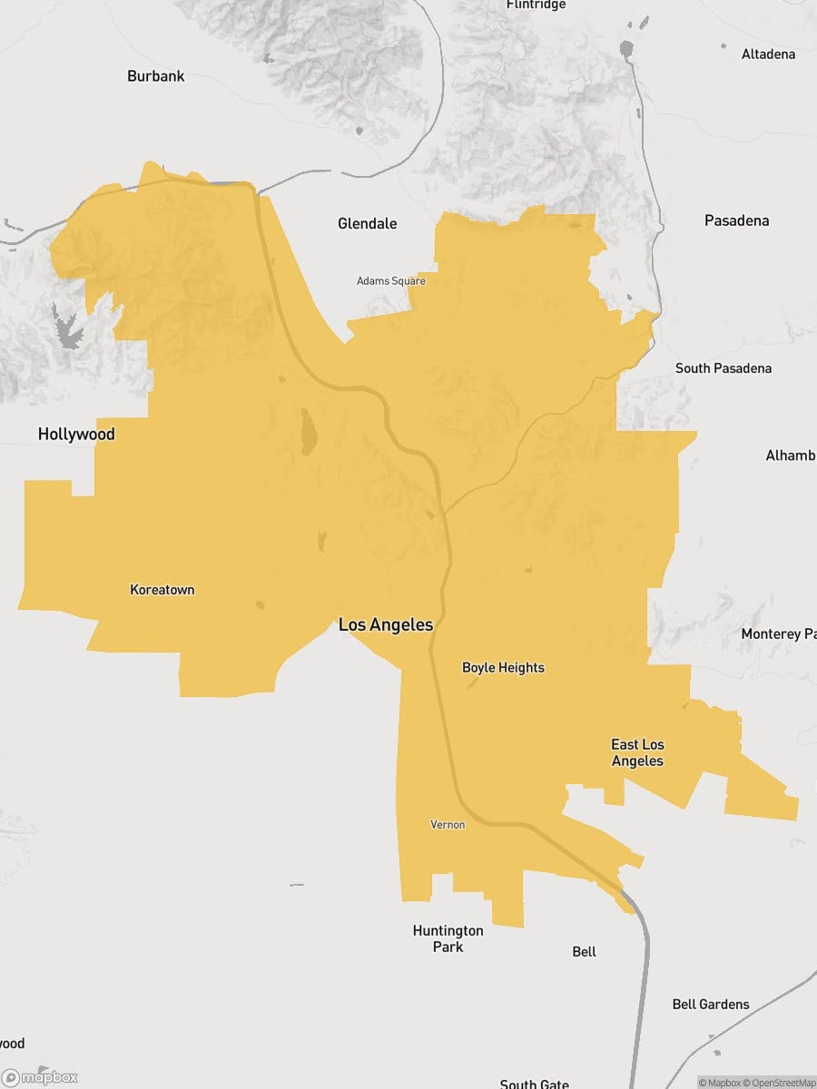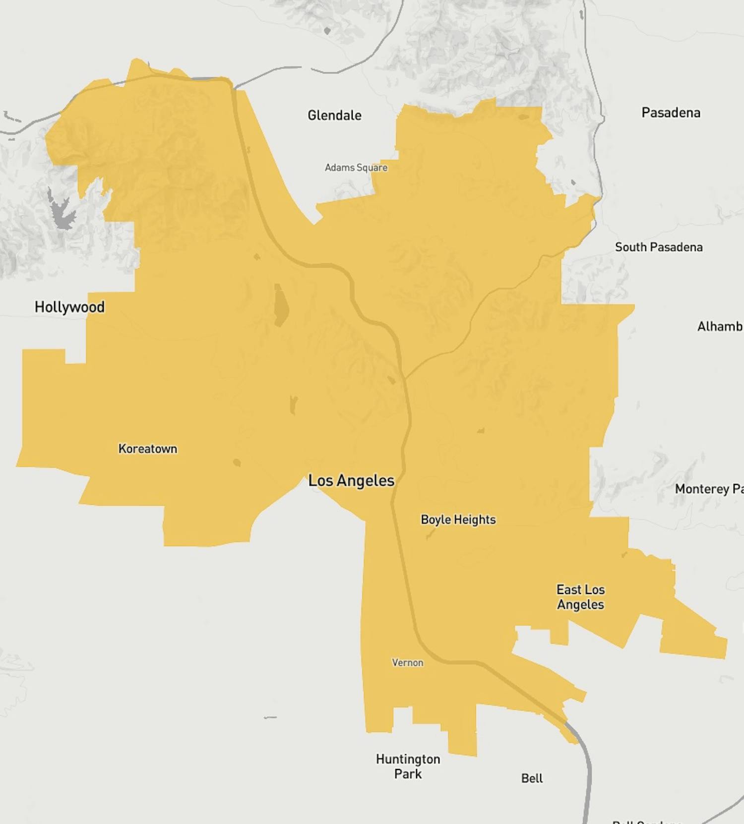 The district includes the Los Angeles communities of Atwater Village, Boyle Heights, Chinatown, City Terrace, Cypress Park, Downtown LA, Eagle Rock, East Hollywood, Echo Park, El Sereno, Elysian Valley, Glassell Park, Hancock Park, Highland Park, Historic Filipinotown, Hollywood, Koreatown, Larchmont, Lincoln Heights, Little Armenia, Los Feliz, Montecito Heights, Monterey Hills, Mt. Washington, Pico-Union, Silver Lake, Thai Town, Westlake-MacArthur Park, Wilshire Center, Unincorporated East Los Angeles, and the City of Vernon.